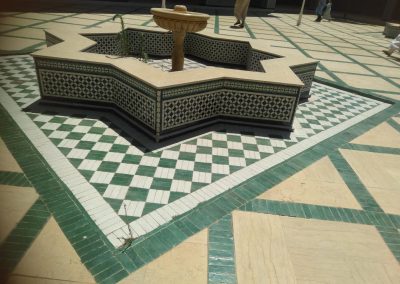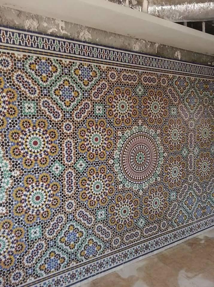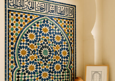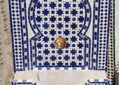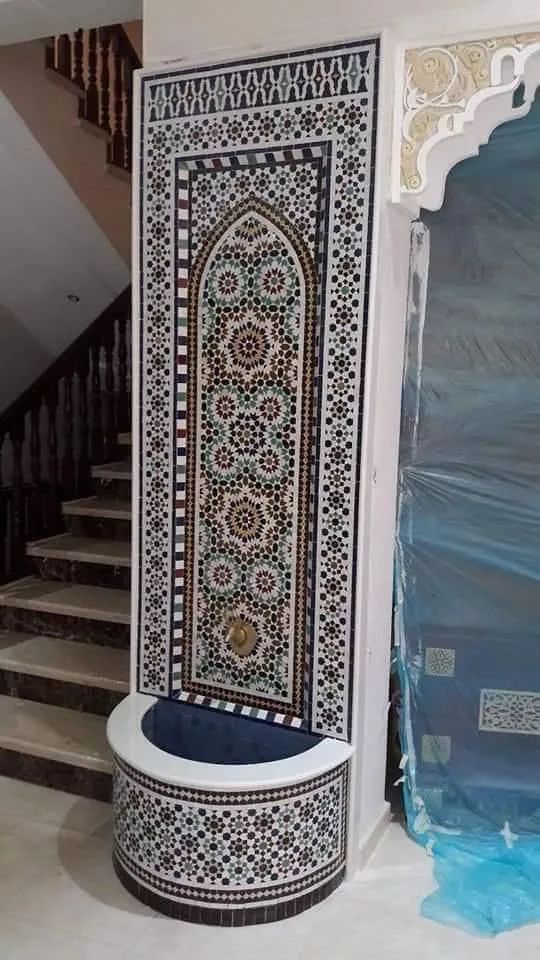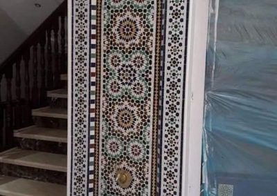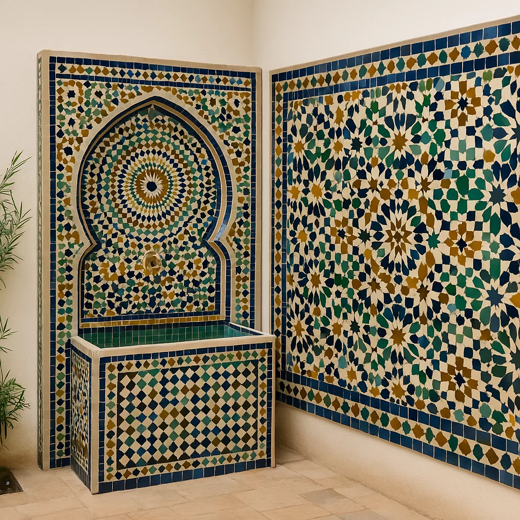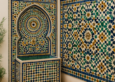Installation experte de Zellij sur murs, sols, fontaines, patios ou escaliers. Un savoir-faire artisanal pour un rendu esthétique et durable.